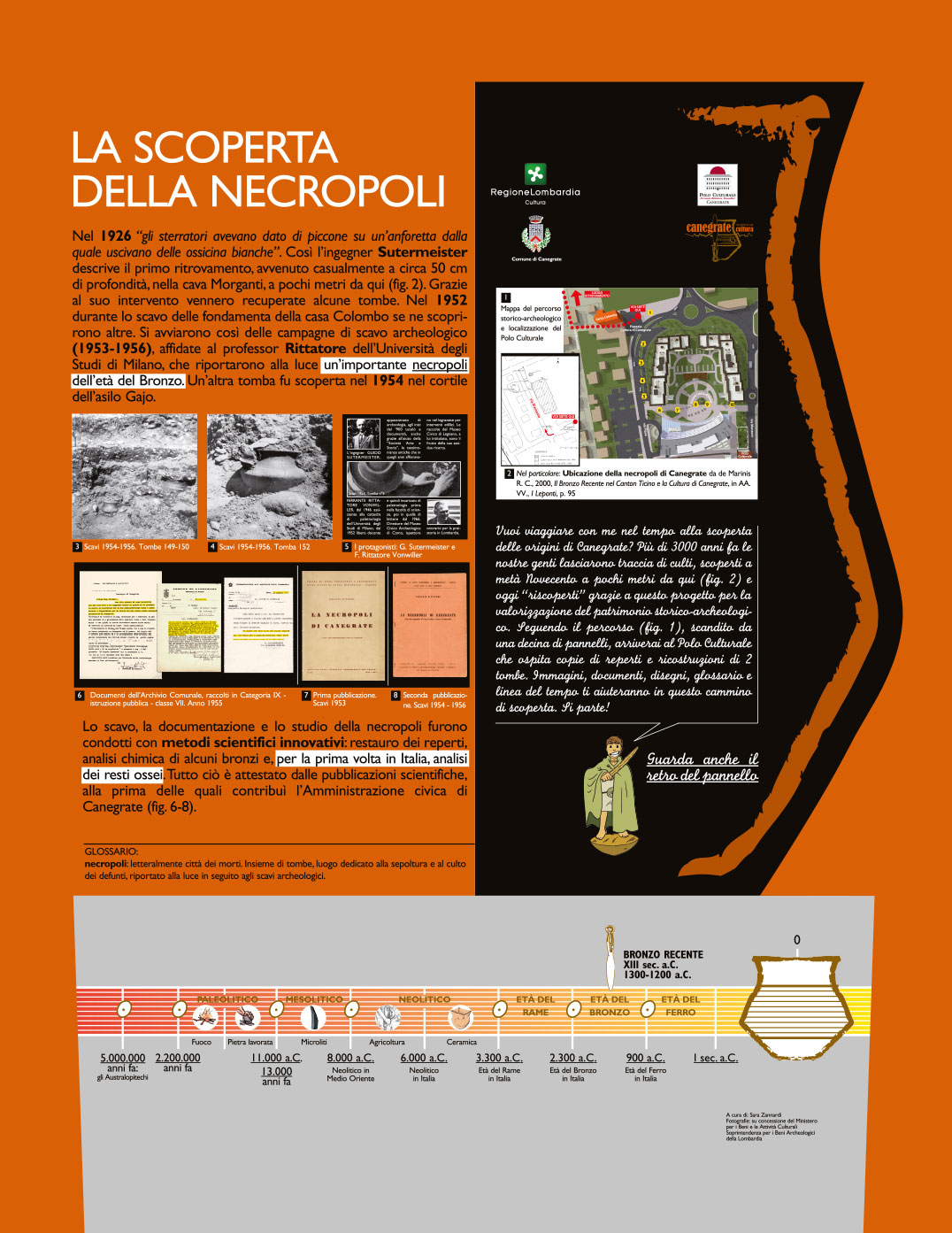 L’inizio di questa “storia archeologica” risale al 1926, quando, grazie all’attenta opera di sorveglianza, documentazione e segnalazione dell’ingegner Guido Sutermeister, al quale è dedicato il Museo di Legnano, proprio a Canegrate, in località Santa Colomba, vennero scoperte alcune tombe di un’importante necropoli dell’età del Bronzo (più di 3000 anni fa), riportata alla luce negli anni ’50, grazie agli scavi diretti dal professor Ferrante Rittatore Vonwiller.